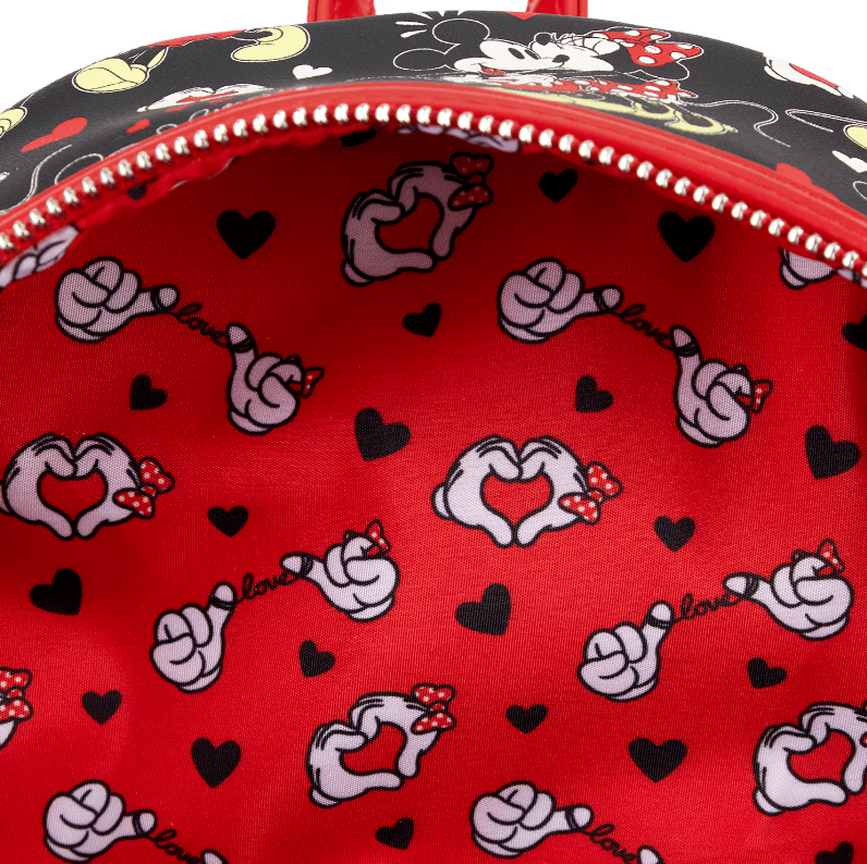 - All-Over Print (AOP): The black faux-leather exterior is covered in a romantic pattern featuring Mickey and Minnie Mouse in various poses, accented by scattered red and white hearts.