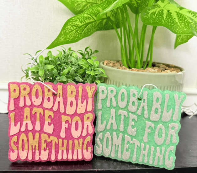 Running late... again? Same. This hilarious "Probably Late For Something" car freshie is the perfect companion for your on-the-go, fashionably-late lifestyle. Handmade with care and packed with your favorite scent, it brings a burst of freshness to your car while delivering a daily dose of truth and humor.
