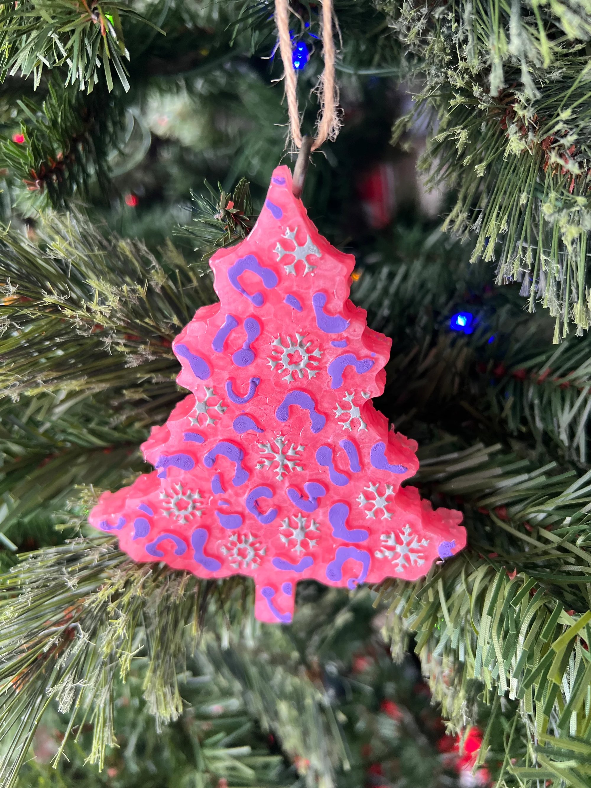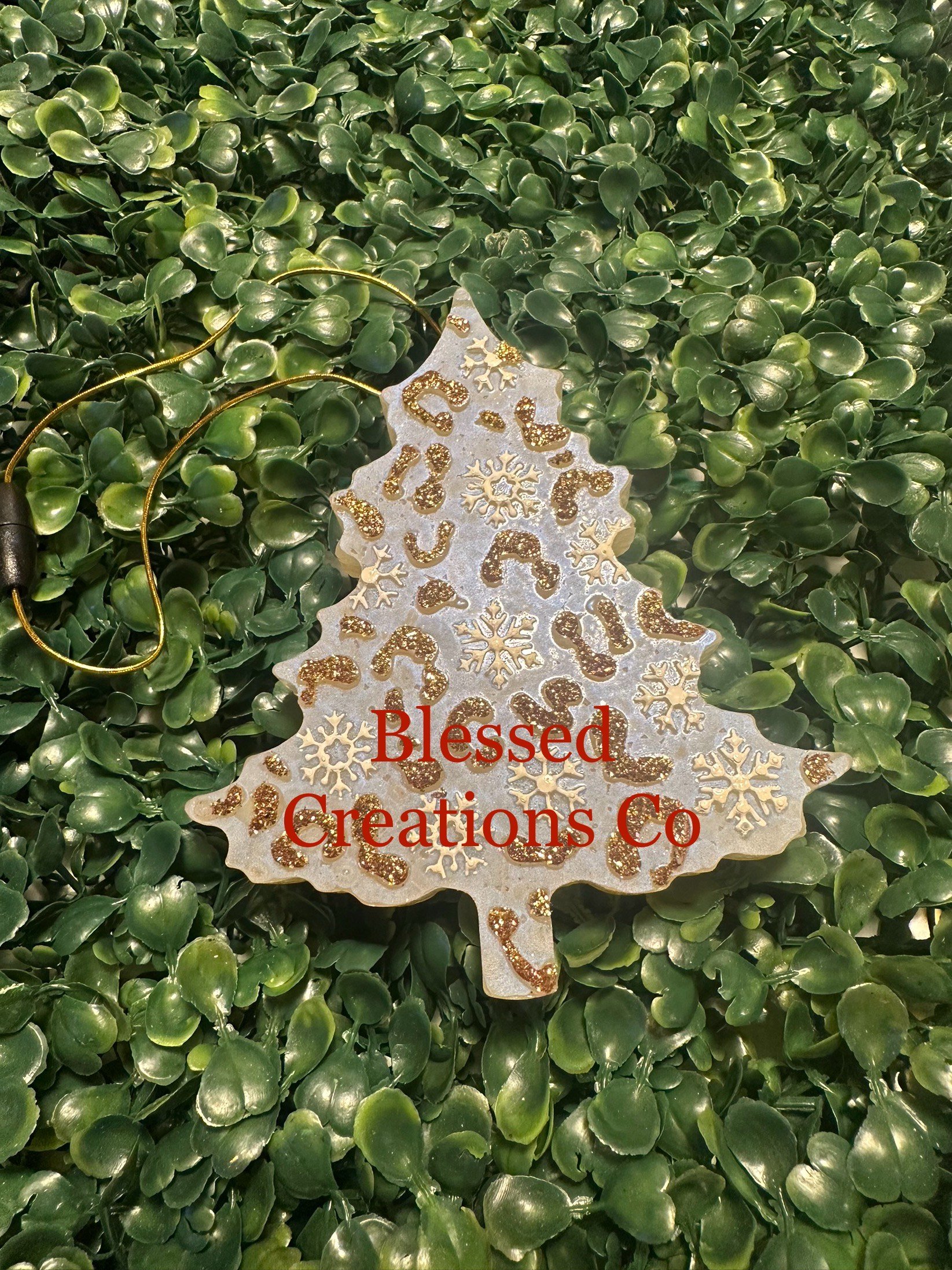 This holiday freshie features a bold leopard print blended with delicate snowflake accents, all in the shape of a classic Christmas tree. It's the perfect mix of glam and seasonal charm, making it a must-have for those who like their holidays a little extra.